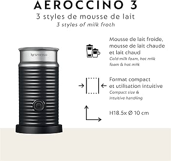 - AEROCCINO: With the Nespresso Aeroccino3 milk frother, you have all your milk frothing dreams at the touch of a button; enjoy silky smooth milk foam that can be prepared either hot or cold