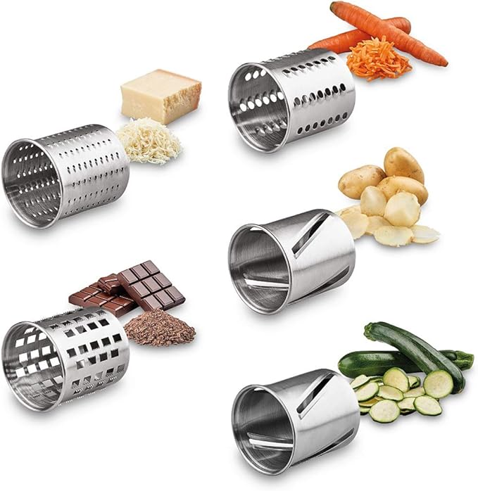 The 5 cutting drums can be easily replaced. You can pull them out of the holder in the motor unit. The barrels are numbered: (1) fine slicing, (2) coarse slicing, (3) grinding and grating hard cheese, nuts, chocolate, breadcrumbs etc., (4) coarse grating of apples, carrots, celery, cheese etc. , (5) Grind apples, carrots, radishes, chocolate or for boiled potatoes and garlic.
