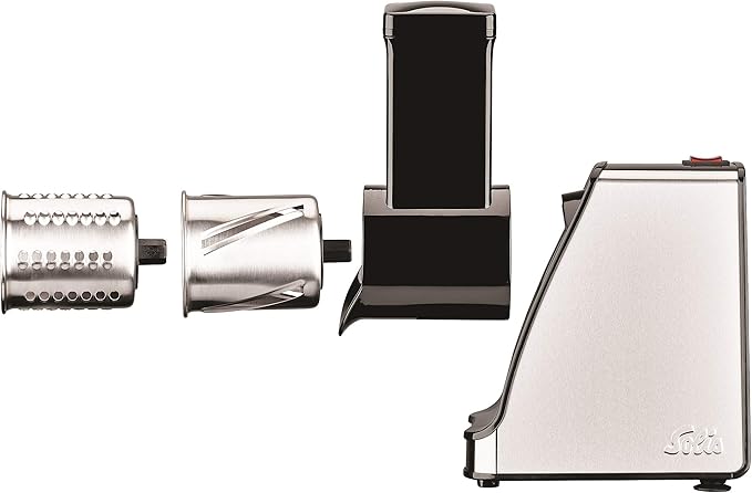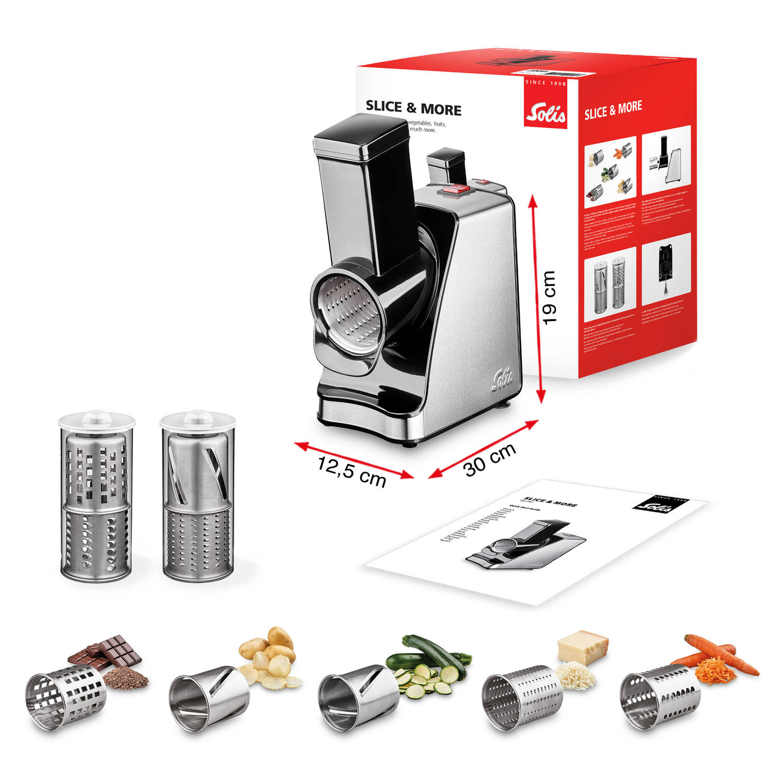 Solis Slice & More 8401 – Multifunctional Vegetable Chopper – Food Processor – Electric multigater for Slicing and Grating – 5 Cutting Drums – Stainless Steel – 2 Speed Settings